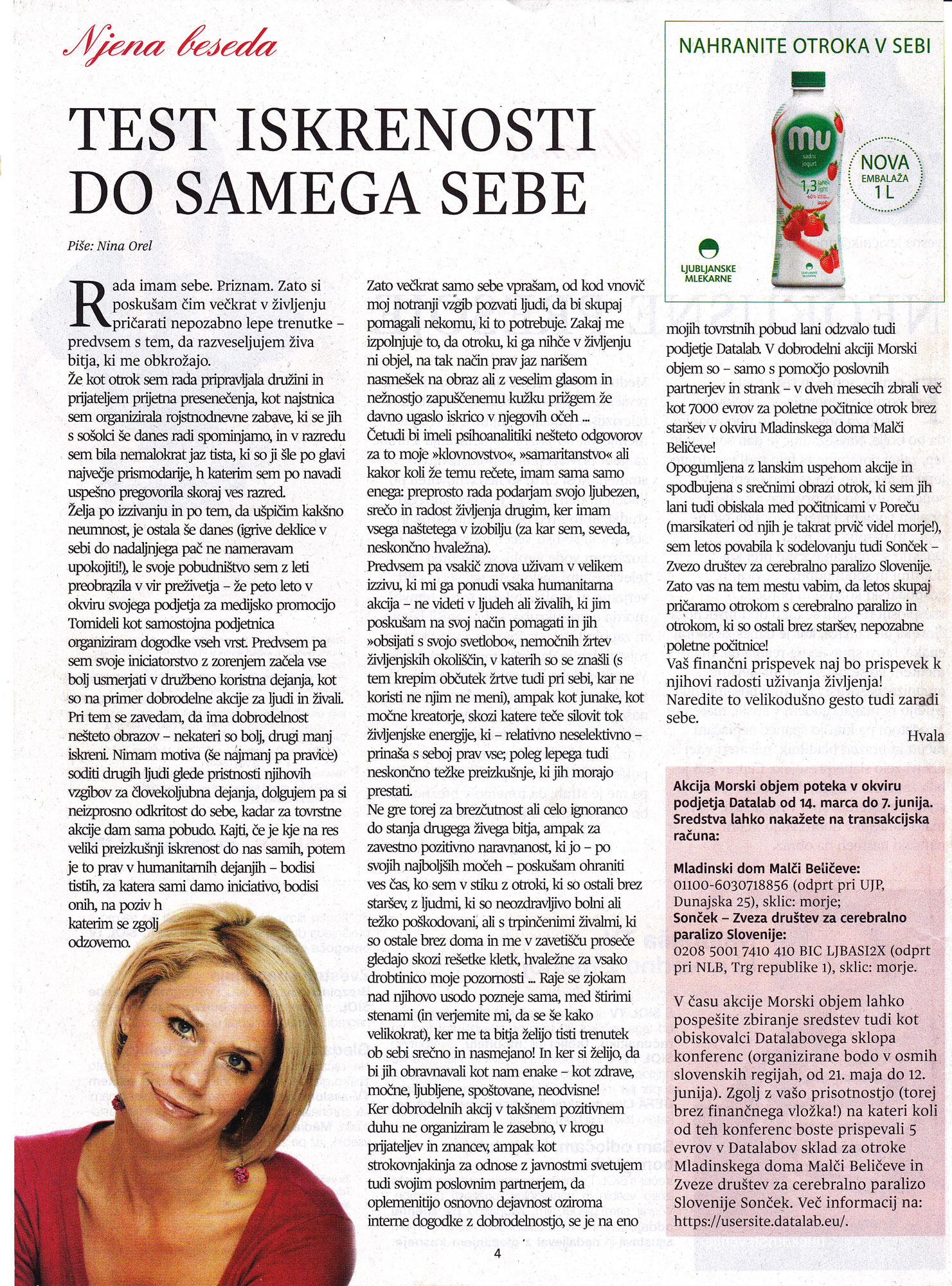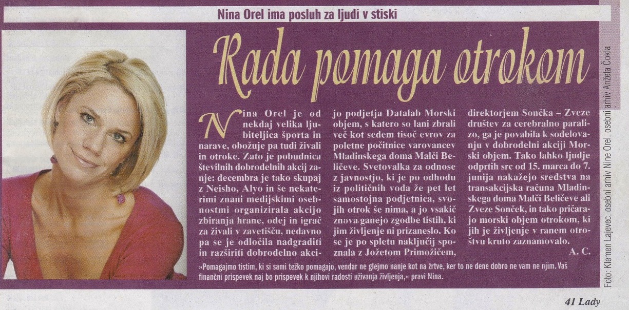 Whenever we make others happy, we thereby give of ourselves and with socially responsible campaigns we can also enrich our business. Join me at charity events for children with cerebral palsy, for orphaned children and for abandoned animals in shelters, which I have already organized for several years with the help of friends and selected Slovenian companies and in cooperation with the Association of Cerebral Palsy of Slovenia SUN, the home for young people Malči Beličeve, the humanitarian-social institution MIRNO MORJE Maribor and shelters for abandoned animals in Ljubljana, Horjul, Postojna and Koper.